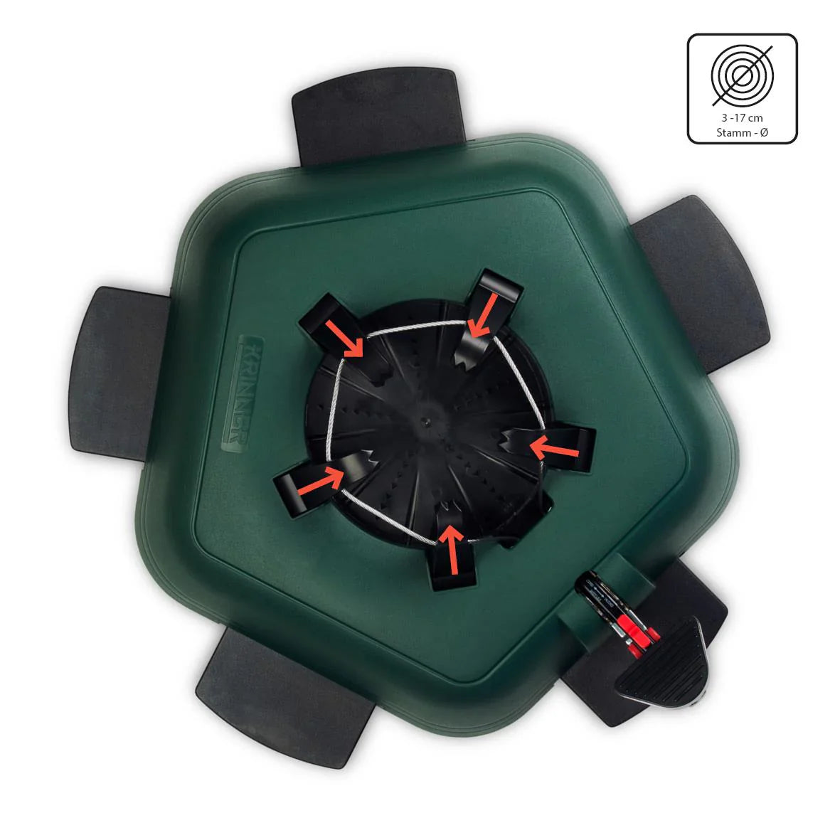 Der beliebte Krinner Genie L macht das Aufstellen Ihres Weihnachtsbaums zu einer echten Ein-Personen-Aufgabe: Stellen Sie den Baum einfach in den Ständer, halten Sie ihn gerade und betätigen Sie das Fußpedal – schon greifen die Halteklauen gleichmäßig rund um den Stamm.